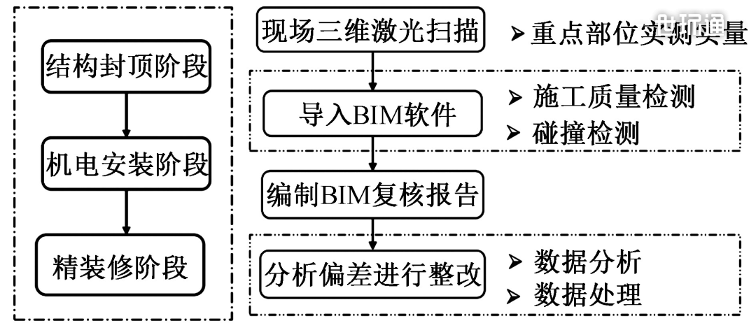 在工程结构封顶、机电安装、精装修阶段,挑选重点区域应用三维激光技术,在机电安装阶段全方位精细测量梁、板、柱等位置,将建筑体1∶1三维点云模型导入BIM模型,进行施工质量检测、点云模型、BIM模型碰撞检测,对比阶段性施工误差,提高测量复核工作效率及准确性,提高施工过程的精细化管理能力,同时为数据分析、数据处理工作提供准确依据。