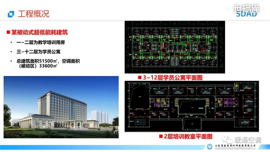 分享项目总建筑面积51500㎡,空调面积(被动区)33600㎡,一~二层为教学培训用房,三~十二层为学员公寓。主要采用高效冷热源设计、高效空调系统设计、机电一体化自控系统、新风机组与变风量末端的一体化控制系统、变频供水、太阳能+地源热泵(热回收)等关键技术。以下为报告PPT: