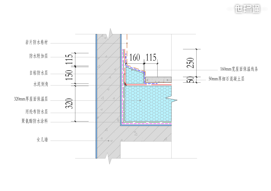 屋面保温防水系统构造设计:从内到外分别有聚氨酯防水涂料、丙纶布防水层、自粘防水卷材、岩片防水卷材四层防水,其中聚氨酯防水涂料和丙纶布防水层位于屋面楼板和保温层之间;自粘防水卷材和岩片防水卷材设置于保温层上方。中间的保温层为双层320mm厚模塑聚苯板屋面保温层(160mm模塑聚苯板+160mm模塑聚苯板),保温层为干作业铺贴,有效避免水分在两道防水层中无法散出,造成保温层处积水。在靠近女儿墙位置设置一圈160mm宽的屋面保温线条,使防水上翻能做出斜坡;同时作为预留的女儿墙内侧保温层起点,有效断开屋面细石混凝土层与女儿墙结构接触,避免产生热桥。