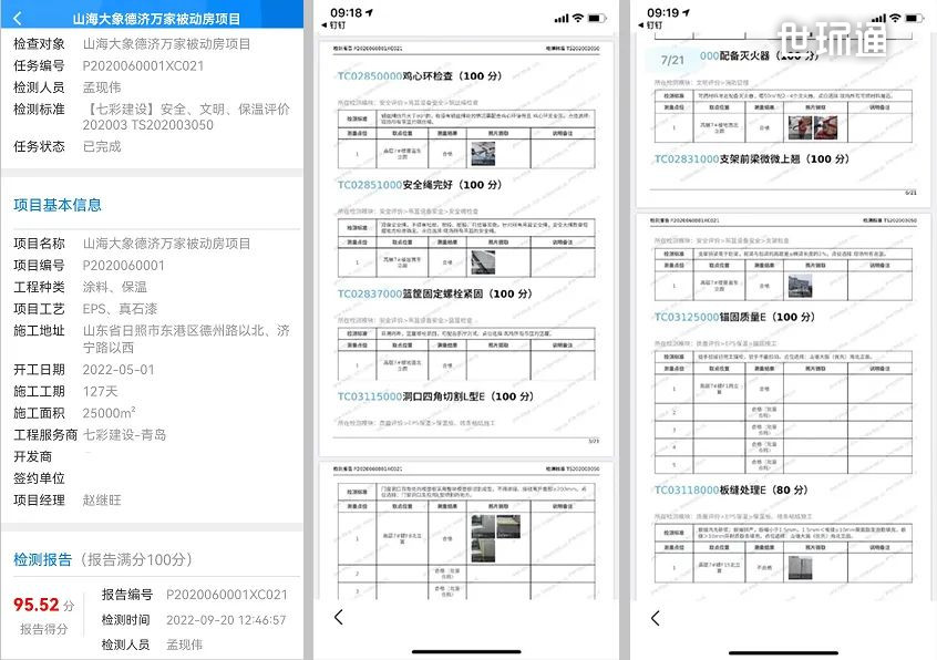 创新性的保温板材设计对基层平整度提出了更高的要求,开槽拼接设计如遇基层偏差,需通过调整粘结层厚度确保保温面层的施工平整度,对采用条粘法施工的本项目来说给施工增加了一定难度。稍有不平基层,如果没有调整和控制手段,就会将不平整的问题放大,影响整面墙的观感。七彩建设在施工前对工人进行现场施工技术培训,对工人的施工手法进行规范要求。在施工中做到实时控制,每台吊篮配备2m靠尺,实行一层一检的严格要求。特别是在总公司FQI品控团队的例行飞检检查中,所测检测点均达到平均平整度≤3mm/2m的要求,观感效果良好。