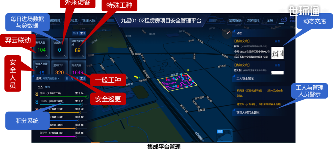 基于二维码的操作,项目部将数据汇总,集成在位于项目现场安全数字指挥室内的安全监控数字化管理中心平台大屏上。该平台为二建集团自主开发,内容包含了每日及汇总的可视化数据,动态记录、警示提示以及工人积分奖励模块等。二建集团还开发了基坑工程安全管理平台、装配式建筑套筒灌浆质量管理平台等,在本项目中进行了专项应用,对项目中安全质量保驾护航。
