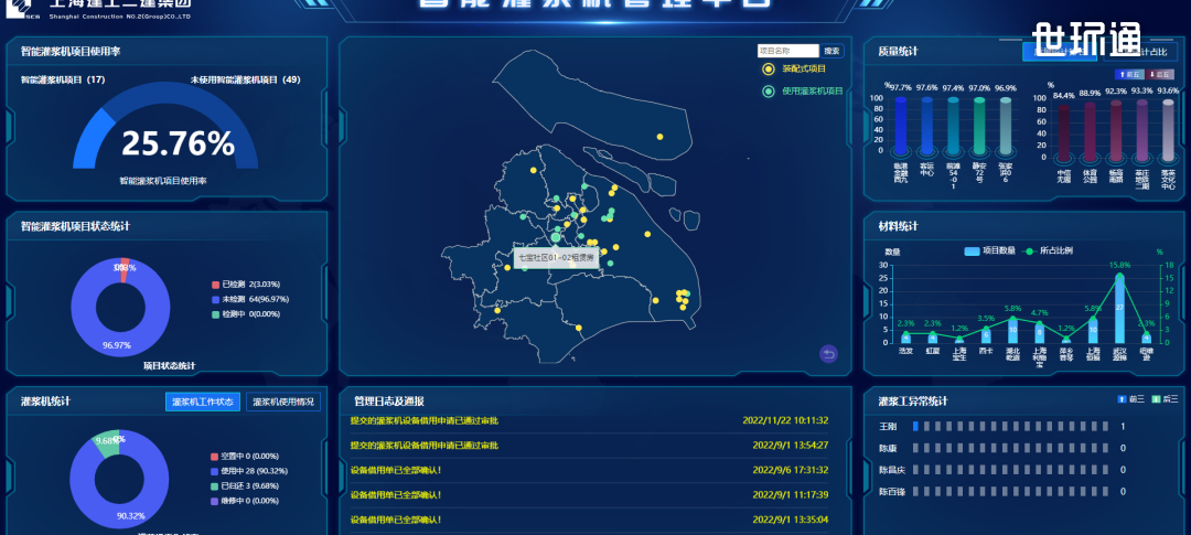 自主研发的二建集团协同管理信息平台,打通了“设计、生产、施工”信息化路径,预制构件不同状态的数量均可在后台数据反映,便于项目合理配置施工资源。天网视频系统监控塔吊、人货梯和操作层区域,对装配式项目进行全过程和可视化管理。自主研发低压力、可监测的智能灌浆机,实现对灌浆质量全过程的实时监控。