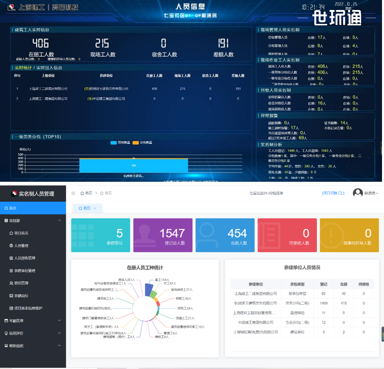 建工集团项目劳务实名制智慧系统采用云平台和工地现场应用端结合方式,现场安装劳务实名制智能门禁,云平台远程在线监控,实时掌握各在建项目人员出入情况、用工数量、特殊工种管控等信息,确保项目合法用工、有效降低风险。生活区、办公区、施工区实行三区分离,严格管控人员进出,实现全方位监控。项目管理人员、施工人员出勤情况实时同步,杜绝现场超龄现象,设置了务工人员综合评价、黑名单预警等功能,有效应对恶意讨薪。
