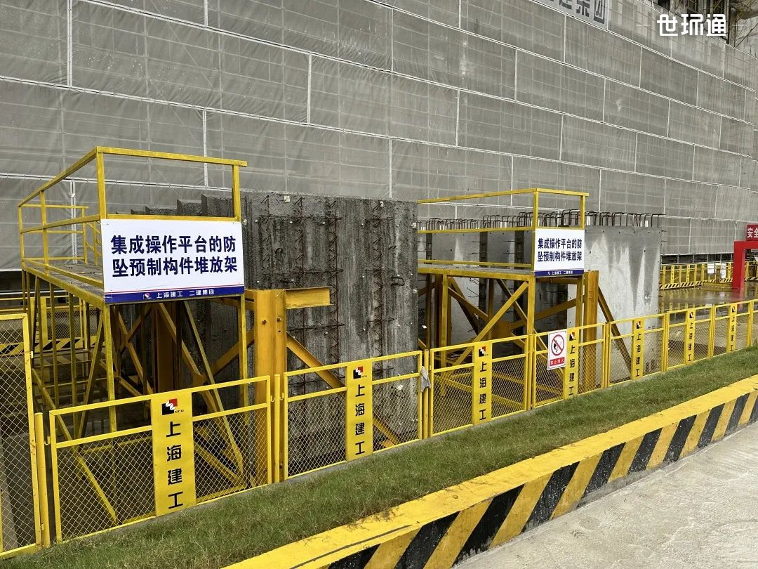结合外墙高精度预制工艺,取消了传统施工中的从底到顶全封闭的外脚手架,上部的PCF结构巧妙地利用板块间连接,形成封闭围档体系,绿化、道路等室外工程可提前施工。该项技术申报“一种多功能预制装配式建筑的施工围栏及其施工方法”发明专利,同时编制了《预制装配式结构安全防护无脚手体系统施工工法》,被评上海市市级工法。