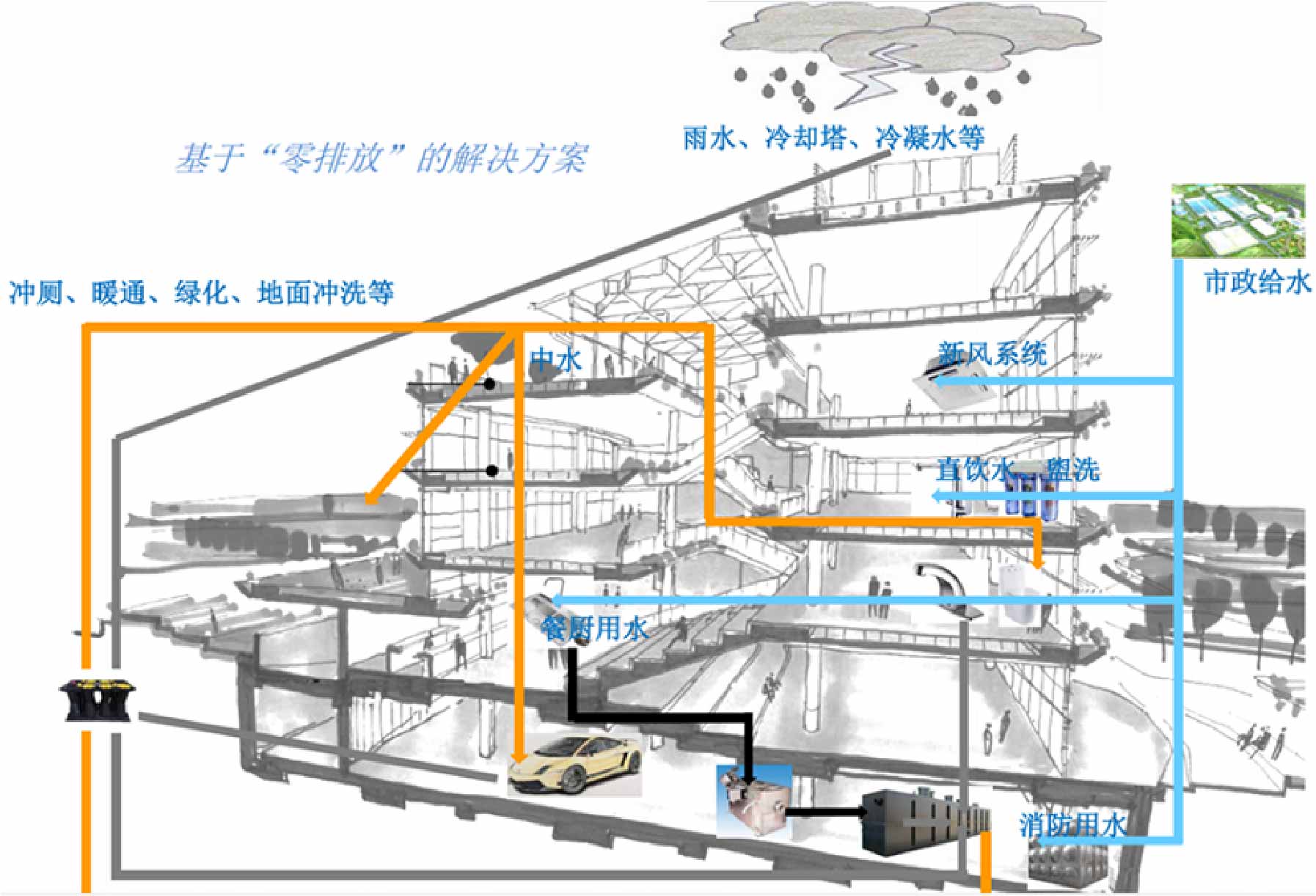 大楼有一套自己的水循环网络,实现了非人体接触用水的自给自足。
