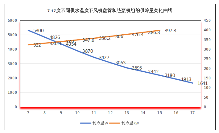 应对超低能耗建筑,暖通空调系统的设计方法将呈现较大的变化:(1)冷热源设备的容量将大幅降低;(2)当末端房间较小且人员密度较低时,须匹配更小容量的末端设备类型,来应对室内的热湿负荷。因为新风必须常开,新风负荷占据了整个系统中负荷的较大份额,可以考虑以新风系统为主要负荷载体,让新风承担更多的负荷:对于围护结构热工性能极好的建筑,当新风承担了所有热湿负荷时,空调系统即是新风系统,不再需要设置其他空调末端形式;对于围护结构热工性能稍差的建筑,负荷不足部分由其他末端承担,当新风承担了湿负荷时,其他末端设备可以处于干工况运行,或半干半湿工况运行。此时使用常规的空调末端,常规末端对中高温水的衰减特性,恰好带来很好匹配超低能耗建筑房间“小负荷”的特征:即当冷源水温提高时,常规末端供冷能力大幅衰减,能很好匹配室内“小负荷”,中高温水系统大大提高了冷源的效率,一举两得,图1给出了某品牌850m3/h风量的风机盘管和标况322KW制冷能力的风冷热泵主机在7℃~17℃水温下制冷量和性能系数的变化情况[3]。(3)由于建筑能耗很低,对气密性要求很高,和传统建筑相比,卫生间,厨房排风渗透负荷无法忽视,须采用显热交换设备实现节能与补风,卫生间采用单独显热交换,其他区域采用全热交换,设计时须引起高度重视;(4)对于小型公建,围护结构热工性能改进体现被动优先原则,暖通空调系统主动优化,因地制宜地采用“热泵+”模式(即徐伟先生提出的多能互补,热泵空调凸显行业贡献的空调系统形式)下的空调冷热源方式:比如采用全氟系统,双冷源新风机来解决室内新风负荷和室内湿负荷,采用显热型VRV空调来解决室内显热负荷,是很好的解决方案。也可采用全水系统,即冷源采用一种或两种出水温度的“风冷+风冷”,或“地源+地源”,或“地源+风冷”等方式,采用双冷源新风机等解决新风负荷和室内湿负荷,采用中高温风机盘管来解决新风所不能承担的“剩余”负荷都是很好的匹配超低能耗建筑负荷的冷热源及末端负荷的解决方案。