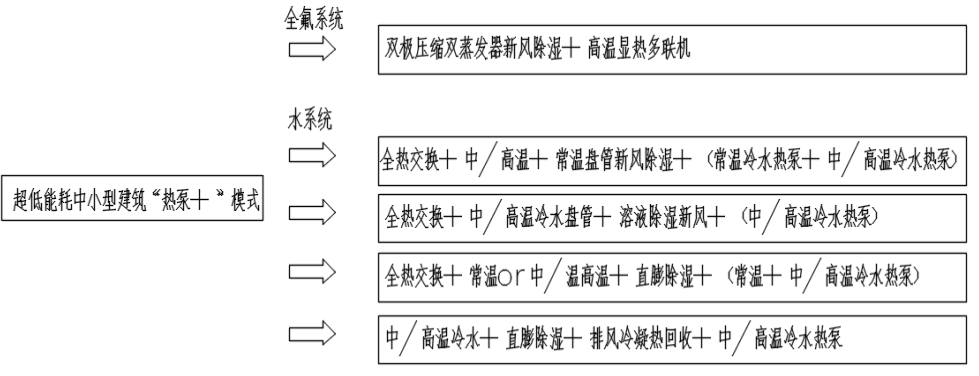 对于小型超低能耗公建项目,采用“新风+风机盘管”新风优先运行的“热泵+”冷热源和末端形式,可以很好地匹配超低能耗建筑的负荷特性。所谓“新风+风机盘管”新风优先运行,即指的是新风承担自身的新风负荷和室内湿负荷及少量显热负荷,夏季提高热泵本身的供水温度,比如在9℃~17℃(9℃~13℃定义为中温冷水,14℃~17℃定义为高温冷水)[6]范围内调整水温,通过提高供水温度,人为地减少普通风机盘管的显热和潜热供冷能力,以匹配室内的“小负荷”,并通过提高热泵机组的供水温度来提高热泵的效率。由于是小型公建,热泵机组可以采用风冷热泵,或土壤源热泵,或风冷与土壤源热泵的耦合系统。至于热泵机组采用何种水温,取决于新风机组的除湿方案。图3罗列了超低能耗中小型公建项目冷热源为不同出水温度的热泵空调,新风优先运行前提下的各种形式的新风除湿机组的类型。