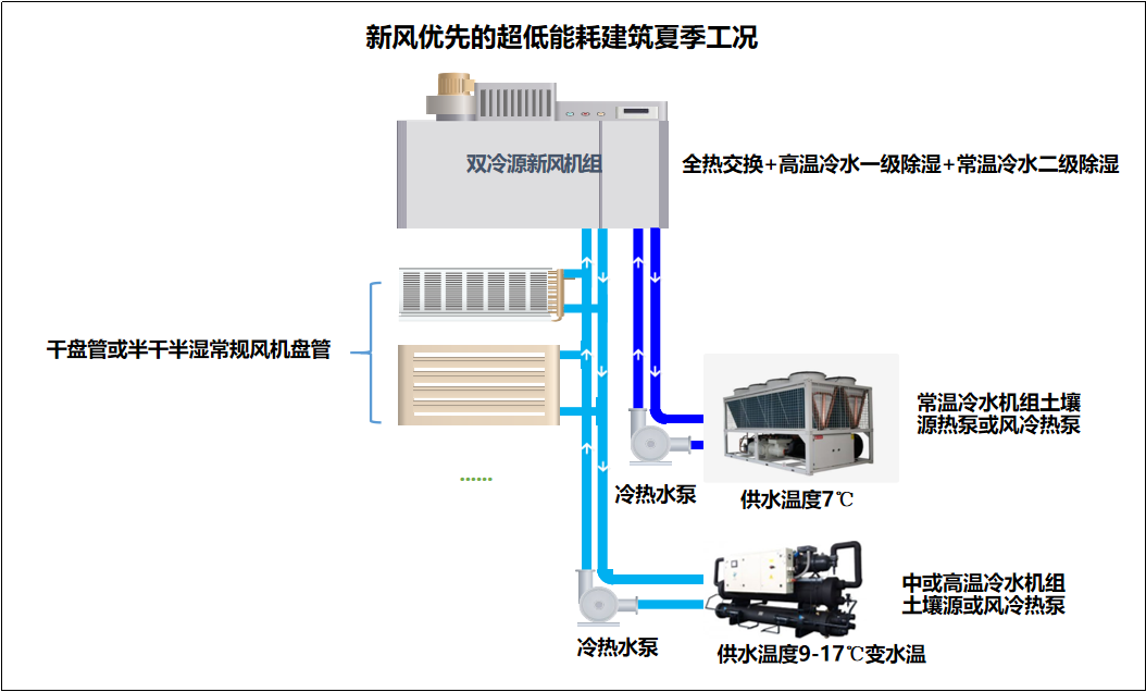 基于以上讨论,超低能耗小型公建项目,暖通空调系统的解决方案的主要指导思想是:让新风承担更多的冷热负荷,不足部分由其他中高温末端来承担,使末端系统和房间“小负荷”相匹配,同时提升整个冷热源系统的能效,以下介绍几种满足小型超低能耗公建系统的暖通空调系统。
