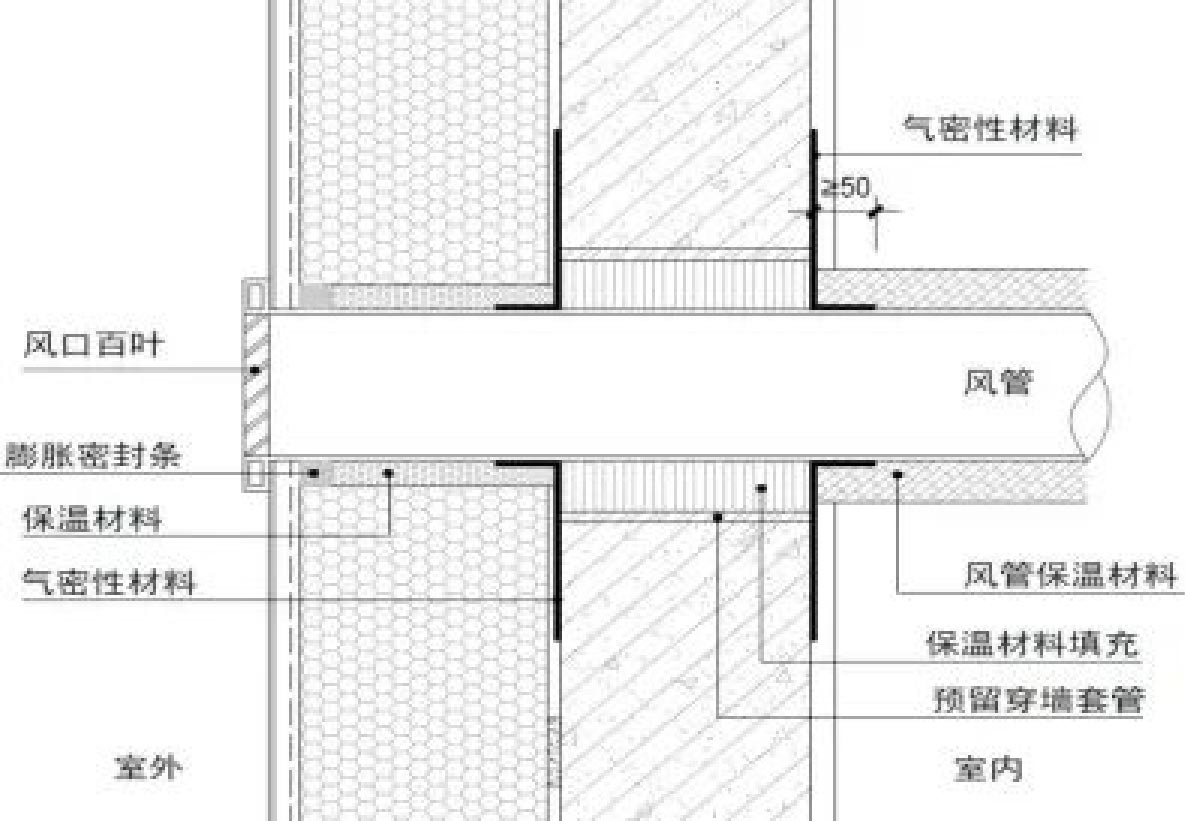 穿墙管是常见的热工薄弱环节,容易产生热桥和气密性缺陷,穿墙风管节点可参考图 2设计。