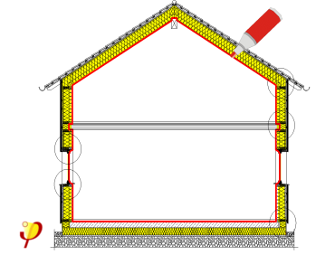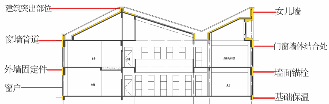 ▲建筑的气密层必须连续(红色为气密层,黄色为外保温)