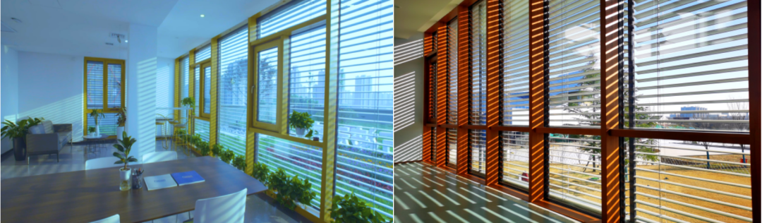 采用带有风、光、雨感系统的外遮阳系统,可根据外界气候变化适时调整遮阳系统处于最佳状态。夏天使用遮阳卷帘有效遮挡太阳直射、斜射,遮阳系数小于0.15,冬天收起遮阳帘,有效利用阳光采暖。打造温和、自然舒适的室内环境。全智能的外遮阳,遮光率可达到80%以上,可有效阻挡阳光直射,防止阳光暴晒和室内炫光;同时百叶帘可通过对叶片的翻转角度进行控制,保证遮阳效果的同时,既保障隐私性,也提供了极佳的视野。