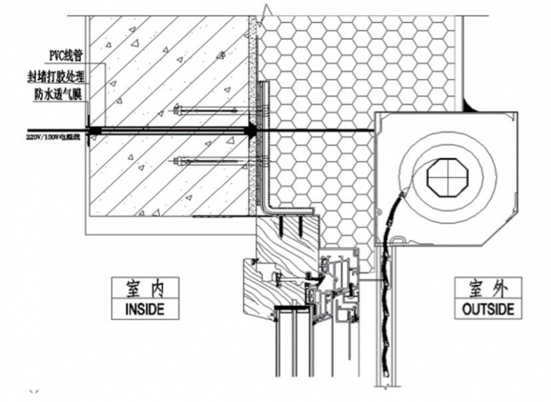 通过图1安装节点图可以看出,将室内外出线口先用发泡胶进行填充,待填充饱满之后再用密封胶进行封堵,并且室内外都使用防水透气膜完全覆盖,以此来解决出线口的气密性和水密性。出线管的冷热桥解决方案是将普通穿线钢管替换成了PVC线管,利用PVC线管导热、散热的功能来避免冷桥产生,减少热量传导。