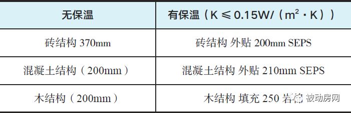 为了保证研究数据多样性和可对比性,笔者首先对研究的墙体结构进行确定。国内农村现有居住建筑的墙体基本都没有铺设保温,与之相反的是被动式超低能耗建筑的墙体结构要铺设较厚的保温材料,且要达到不同气候区对于墙体保温的要求。因此笔者列出表1中两种较为极端的情况:一种是墙体结构不安装保温,另一种是墙体结构安装保温且传热系数达到被动式超低能耗建筑中寒冷地区对墙体K值的要求。依据表2《被动式超低能耗绿色建筑技术导则》,寒冷地区围护结构平均传热系数参考值为0.10~0.25,笔者取K≤0.15W/(m²·k)墙体结构进行计算模拟[2],依据窗户安装位置的调整,引起洞口的线传热系数变化,最终得出不同的墙体结构被动式门窗安装的最佳位置。