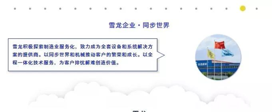雪龙企业始终坚持文化交流、科技研发、优选人才的方略。一直在文化、科技、人才上的前进。用文化的交流带动科技的发展;用科技的发展带动产品的进步;用优秀的产品吸引优质的人才;用企业的前进带动行业的前进,为社会创造价值。在智能时代扬帆再起航,领于时代之先,再谱新篇章。