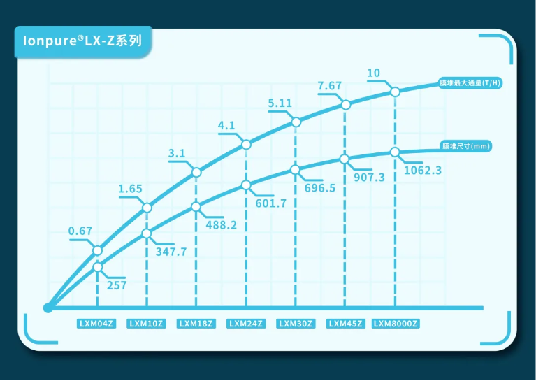 该项目采用的LX8000Z大流量工业型 CEDI 膜堆,为懿华于2023年5月推出的Ionpure® LX-Z系列的最新型号。LX8000Z单台膜堆典型的设计产水流量为8m3/h。相较于LX-Z系列的其它型号,LX8000Z最直观的体现为膜堆尺寸的增加以及由此带来的产水流量的增大: