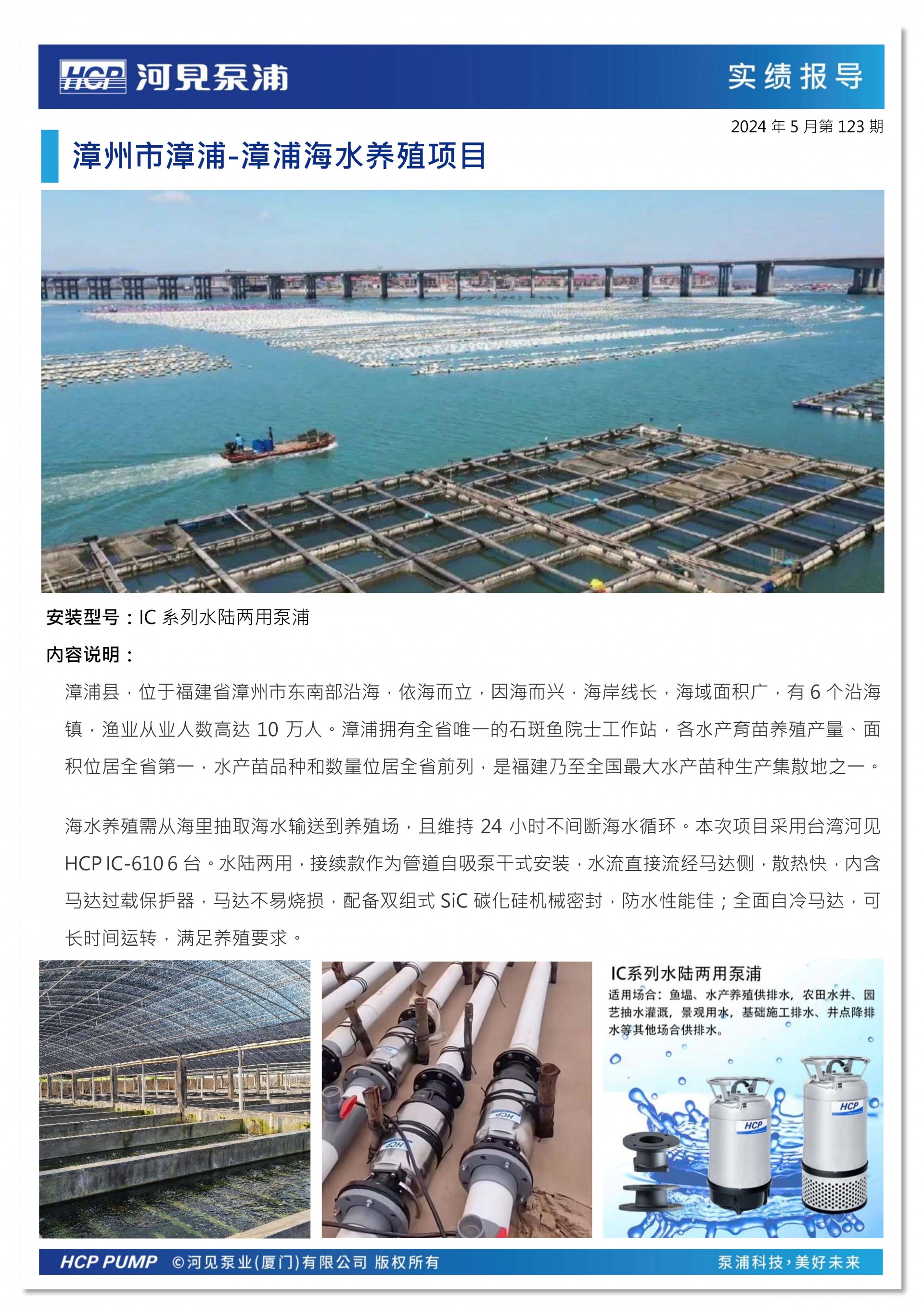 海水养殖需从海里抽取海水输送到养殖场,且维持24小时不间断海水循环。本次项目采用台湾河见HCP IC-610 6台。水陆两用,接续款作为管道自吸泵干式安装,水流直接流经马达侧,散热快,内含马达过载保护器,马达不易烧损,配备双组式SiC碳化硅机械密封,防水性能佳;全面自冷马达,可长时间运转,满足养殖要求。