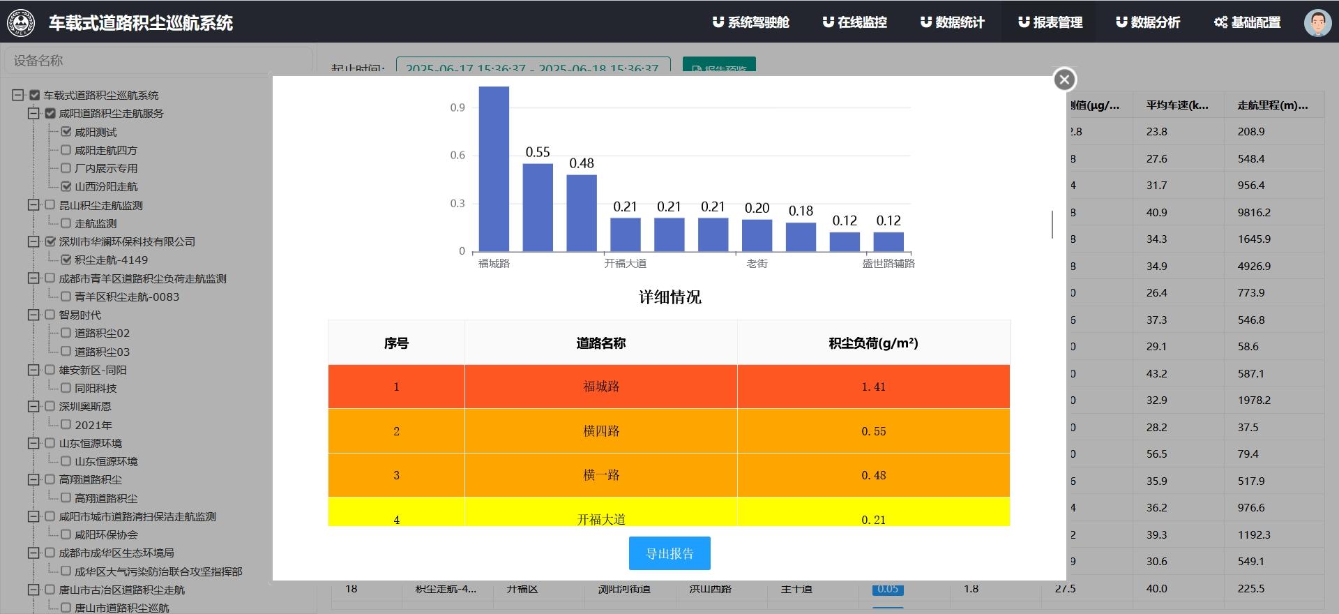 自动生成报告:走航结束后,系统自动生成走航报告,提取超标路段数据,形成积尘污染日历图。
