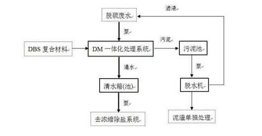 将收集箱内脱硫废水用泵引入DM一体化处理系统进水缓冲区,经进一步均质与调速后,溢流进入反应区,在反应区中搅拌作用下,与投药箱自动投加进来的DBS粉状药剂材料均匀混合,在一、二级反应区中完成pH值调节、重金属吸附螯合、混凝与絮凝等物化反应,反应过程结束后泥水混合物自动溢流进入1~4级沉降区,完成泥水分离(即固液分离)过程,清水自流入出水缓冲区,并进行检测分析,然后自流入清水箱(池),清水可送往浓缩除盐工艺进行除盐处理。DM一体化处理系统中沉降分离出来的污泥定期间歇自动排往污泥池,经污泥泵送往脱水机脱水后泥饼单独处理,滤液水进入脱硫废水收集箱重新参与处理过程。