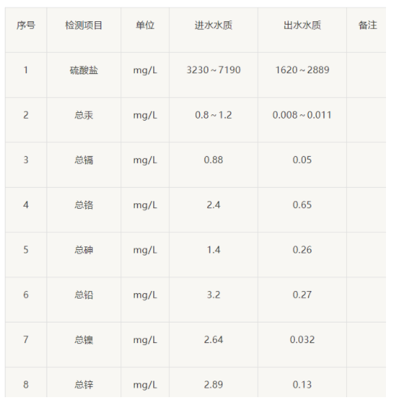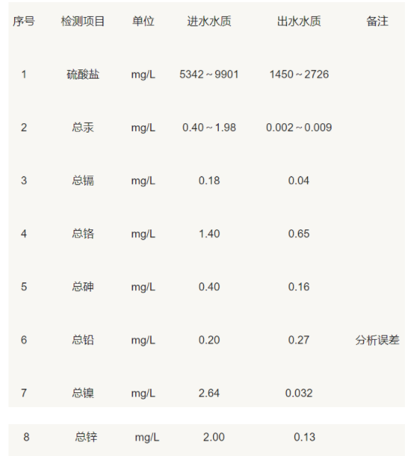 2017年3月,在陕西某发电公司新建一套DBS/DM一体化脱硫废水处理系统,处理能力10~15m3/h。该公司原来建设有三联箱脱硫废水处理系统,因石灰乳投加系统、三联箱处理系统易出现堵塞情况导致三联箱无法长周期稳定运行,导致脱硫废水处理后出水水质不稳定,且当原水水量、水质(主要是悬浮物)变化幅度大时,出水水质直接恶化。故障频繁,为现场生产管理与实际操作增加了很大难度,而DBS/DM一体化处理系统抗负荷冲击力强,不堵塞设备与管理,运行连续稳定。其进出口水质情况如下表2所示。