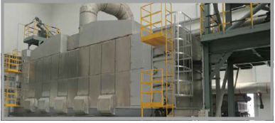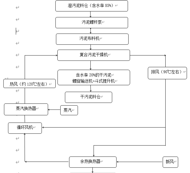 采用蒸汽供热,通过蒸汽换热器将空气加热成120℃左右的热风,热风通过管道进入复合污泥干燥装置,与污泥直接接触干化,对湿污泥颗粒进行吹扫,水分被逐渐蒸发带走,污泥颗粒最终被干化至含水率20%以下。