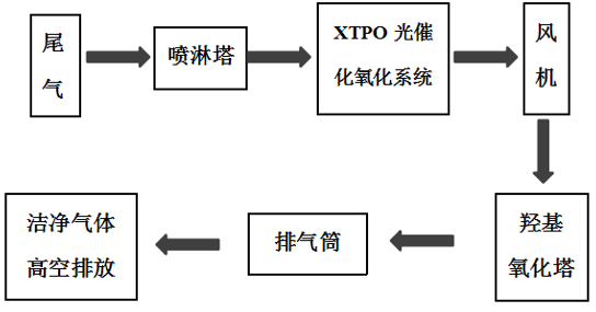 (3)废气经XTPO光催化氧化系统处理后进入最后一道羟基氧化塔,作为XTPO光催化氧化系统的后续处理,此塔能够延长废气的停留时间,有效去除光催化过程中产生的臭氧,通过与连续获得金属阳离子作用而发生氧化-还原反应,使污染物彻底分解、降解,并实现上一步中间氧化产物的再氧化,最后使废气得到彻底净化。
