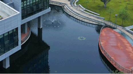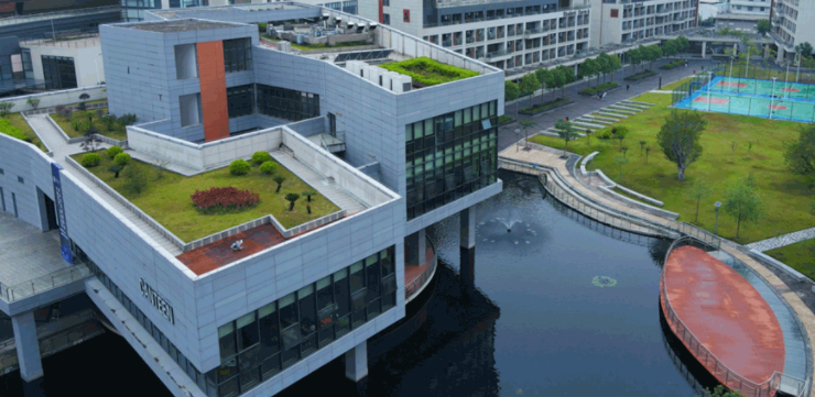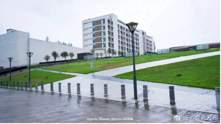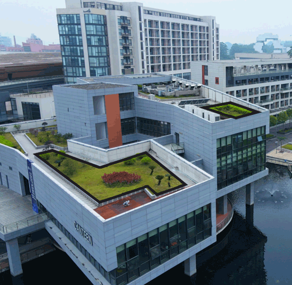 广东以色列理工学院北校区布设有绿色屋顶、透水铺装、下凹绿地及调蓄池等海绵设施,充分体现了海绵城市建设“渗、滞、蓄、净、用、排”的理念。