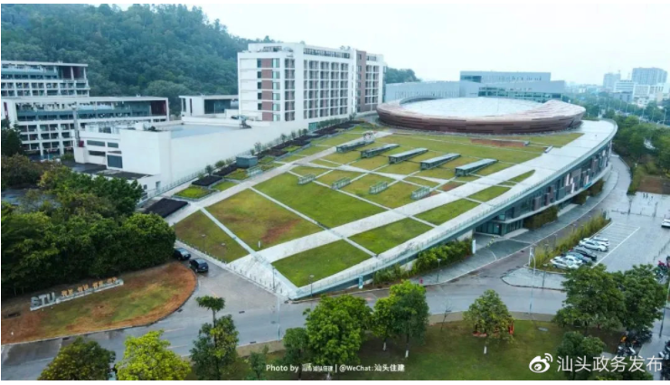 汕头大学新体育馆建有绿色屋顶,能很好地利用雨水这一宝贵资源——屋顶的植被能大量吸收屋面雨水,减少周边发生内涝的风险,同时保证建筑冬暖夏凉。