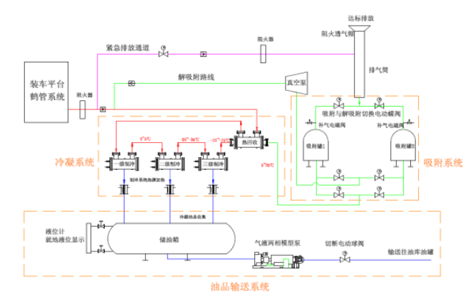 该油气回收项目的工艺流程,按功能划分可分为冷凝、智能融冰、油品输送和吸附四个单元。