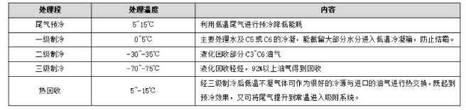 本装置通过采用压缩机机械制冷和多级冷却方法连续降低油气的温度,使各组分在分压力下,分别降至对应的露点温度,油气各组分分级冷凝为液态。同时通过特殊设计换热器,使有机组分充分实现气液分离,低温洁净的空气经回热交换后,降至常温送往吸附罐。各级制冷参数如下: