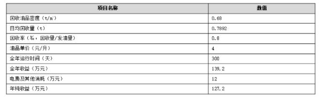 表2收集了连续半个月用电及收油数据,当月平均气温20℃,可得出回收率(回收油量/发油量)约为9‰,平均耗电约为357度/天,经济效益明显高于运行成本。表3针对全年经济净收益进行分析。通过经济效益分析表计算,1度电能回收10元的油品价值。