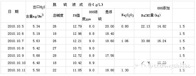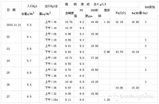 贵州黔贵天能焦化业是贵州省的企业,年产焦炭120万吨,采用自产回收氨水作碱源,加888-JDS催化剂的湿式氧化法脱硫。处理焦炉煤气量约30000m3/h,入口H2S5~7g/m3;出口要求H2S含量<100mg/m3。双塔并联流程,高塔再生工艺。回收硫膏送硫酸工序。自2010年11月20日应用来效果如下: