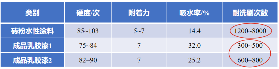 砖粉水性涂料的附着力为5~7,略低于成品乳胶漆的7