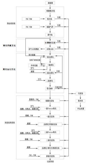 (4)本系统的深度处理系统中混凝沉淀、多级Fenton流化床主要通过物理化学的作用对渗滤液中的化学需氧量进行处理。而多级生物流化床则通过海绵载体上负载的异氧菌、反硝化菌以及外加碳源对渗滤液中的总氮进行生物处理。外排沉淀池则通过絮凝剂的混凝沉淀作用确保出水化学需氧量及悬浮物达标;整个深度处理系统均采用物理化学及生物作用而非膜浓缩的方式对渗滤液进行全量处理,确保其全量达标,除污泥以外不产生浓水或其他二次污染物。