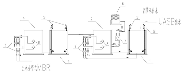 其中,1—一级反硝化池,2—一级硝化池,3—二级反硝化池,4—二级硝化池,5—潜水搅拌机,6—冷却塔,7—板式换热器,8—射流曝气器,9—回流泵