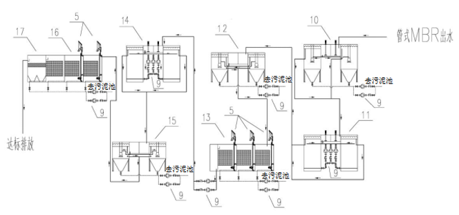 其中,5—潜水搅拌机,9—回流泵,10—混凝沉淀池,11—一级Fenton流化床,12—一级Fenton沉淀池,13—反硝化生物流化床,14—二级Fenton流化床,15—二级Fenton沉淀池,16—反硝化/硝化生物流化床,17—外排沉淀池