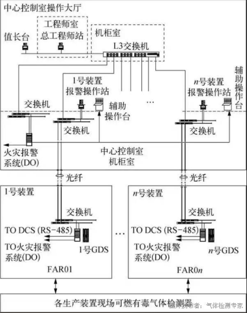 对于大型联合化工厂来说,GDS的设置既要满足可燃及有毒气体检测与发出的报警信号功能不受对应装置控制系统故障的影响,也需要满足中心控制室与现场仪表机柜室相结合的设置特点,即GDS的控制器只能安装在紧邻生产装置的现场仪表机柜室,其显示报警设备只能安装在中心控制室内,为此建议如下: