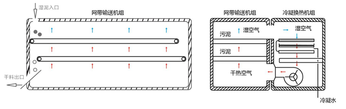 网带式干燥透气性好,可以增加热风与物料的接触面积,换热效率高;污泥静态放置,减少粉尘量及延长网带的使用寿命;