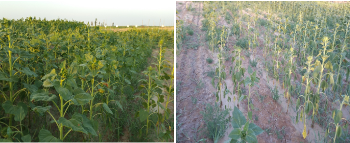 左为施用本农土壤调理剂后的出苗情况,右边为对照。播种后50天左右拍摄