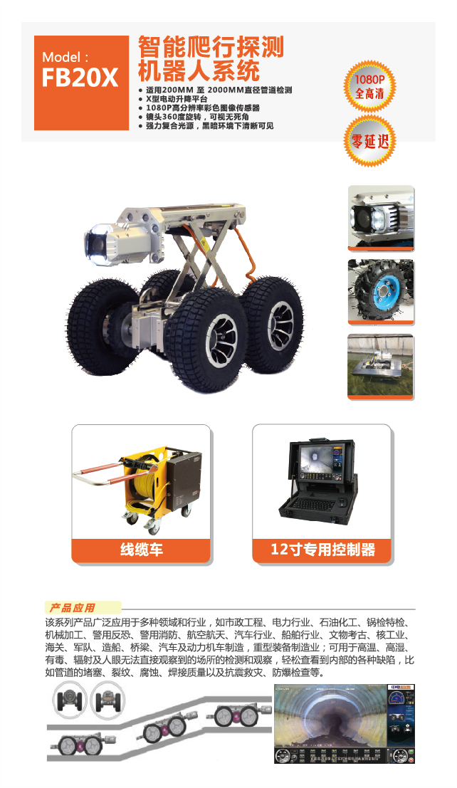 该系列爬行机器人检测系统,是以智能轮式运动机构作为搭载平台,配备工业级高分辨率彩色摄像单元、运动姿态检测单元和智能控制影像录制处理终端,辅助强力照明光源和线缆卷收装置的高科技检测专用产品,可以根据应用场所需求,搭载热成像仪、声纳、机械手、树根切割机、毒气检测仪等等传感器或专用工具,实现对各种隐蔽空间、水下、易燃、易爆、辐射等高危场所进行实时影像检测、分析处理。