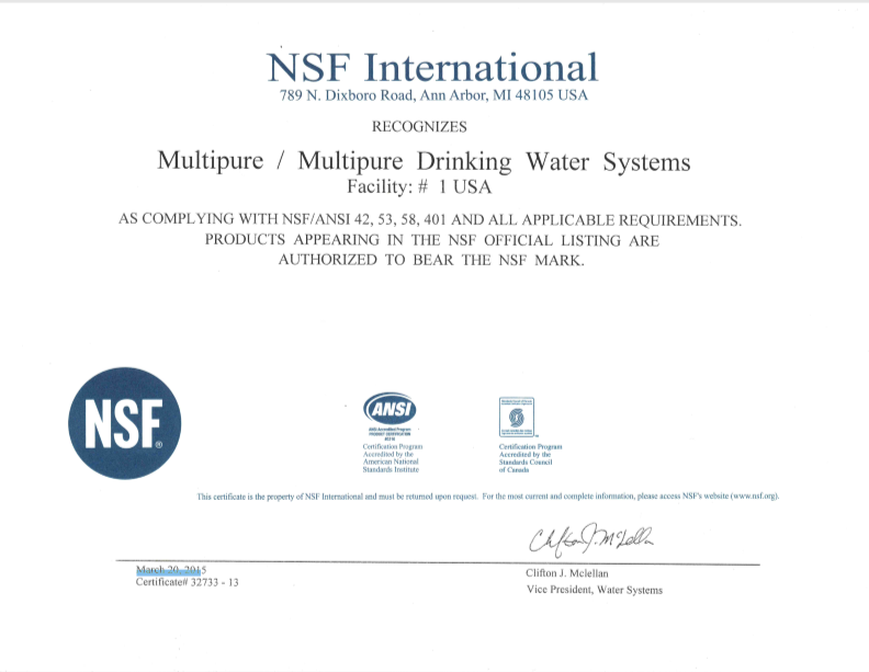 2015年美国NSF机构对美而浦产品颁发的认证证书