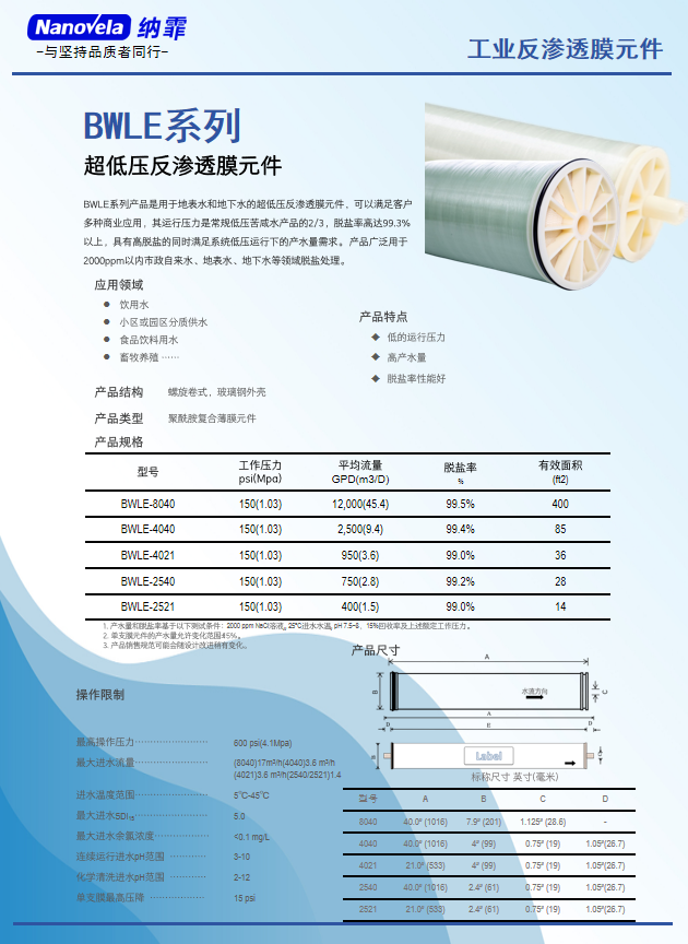 BWLE-8040 工业用反渗透膜元件可满足多种商业应用中的客户需求。BWLE-8040 采用世界领先的高品质反渗透膜片,保证了Nanovela产品的高品质性能。BWLE-8040具有优秀的抗污染性,并具备稳定的脱盐率和产水流量,广泛应用于水处理系统中(如市政用水、地下水处理、苦咸水处理等)。