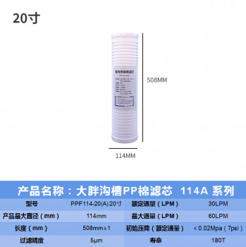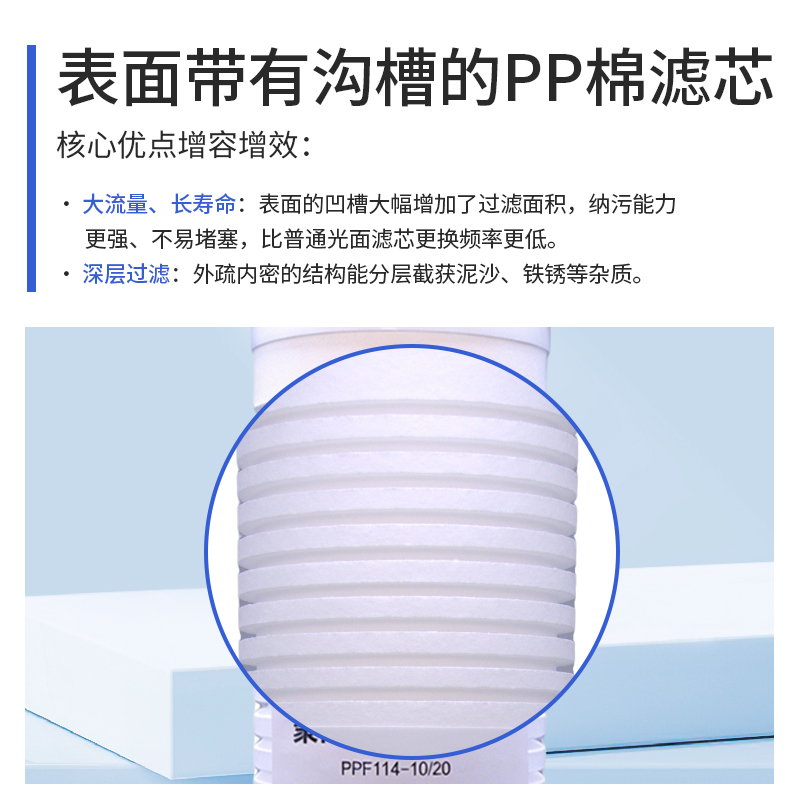 表面带有沟槽的PP棉滤芯。核心优点在于增容增效: