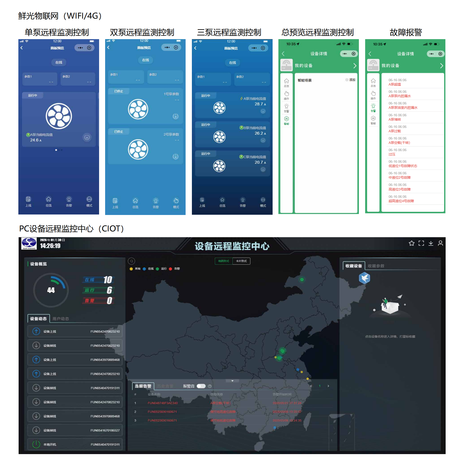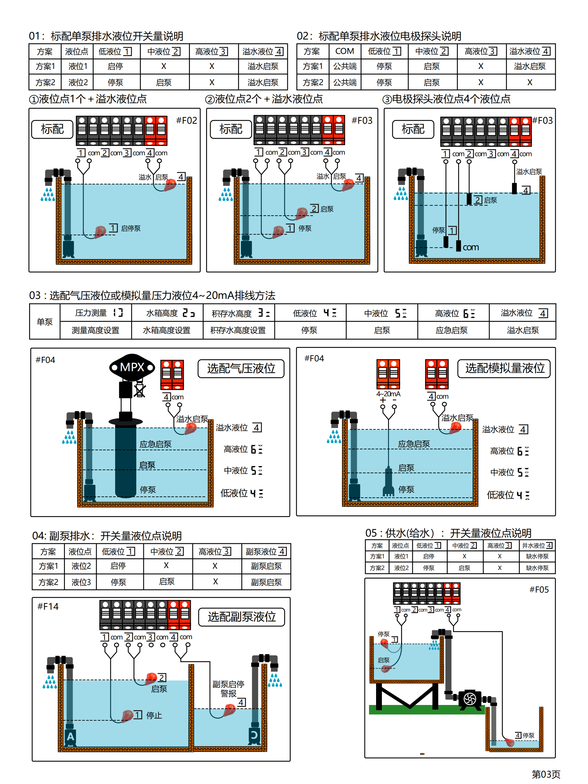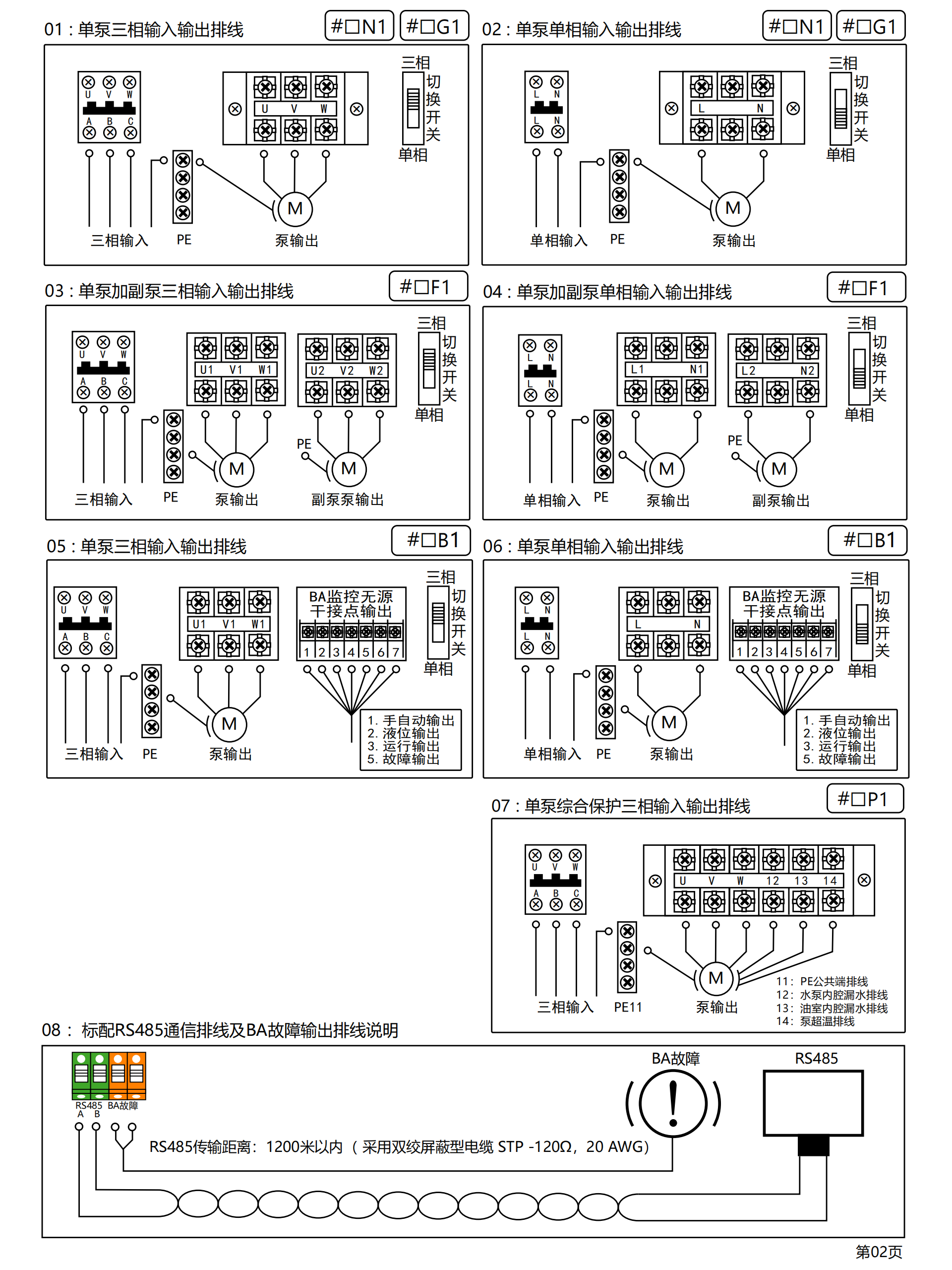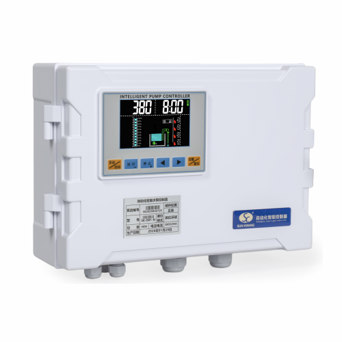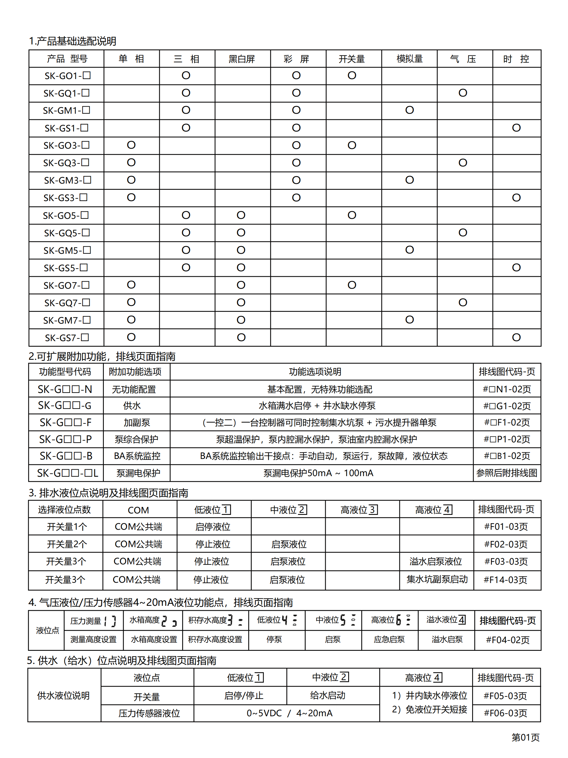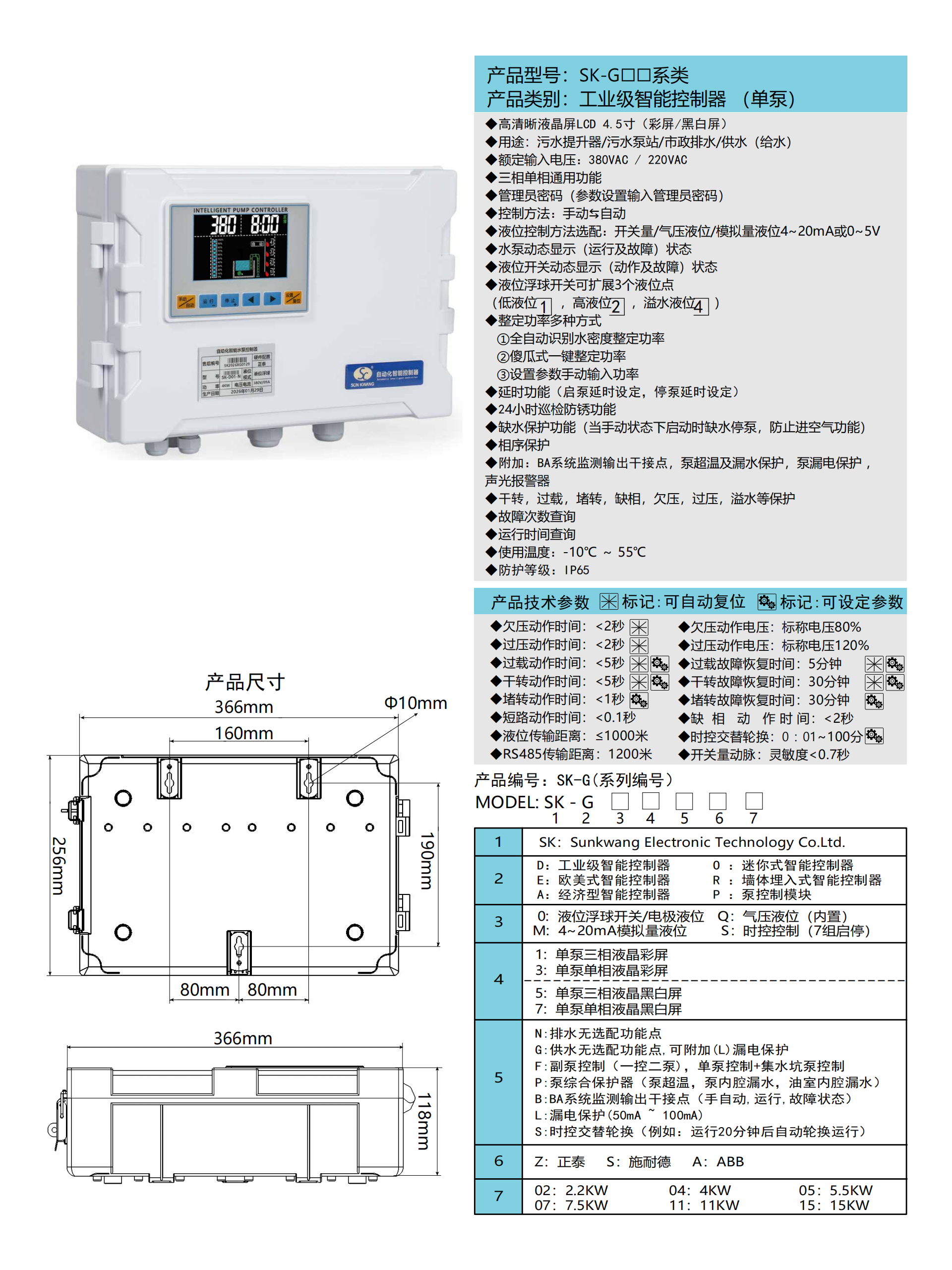 产品型号:SK-G□□系类 产品类别:工业级智能控制器(单泵) ◆高清晰液晶屏LCD 4.5寸(彩屏/黑白屏) ◆用途:污水提升器/污水泵站/市政排水/供水(给水) ◆额定输入电压:380VAC / 220VAC ◆三相单相通用功能 ◆管理员密码(参数设置输入管理员密码) ◆控制方法:手动⇋自动 ◆液位控制方法选配:开关量/气压液位/模拟量液位4~20mA或0~5V ◆水泵动态显示(运行及故障)状态 ◆液位开关动态显示(动作及故障)状态 ◆液位浮球开关可扩展3个液位点(低液位①,高液位②,溢水液位④) ◆整定功率多种方式 ①全自动识别水密度整定功率 ②傻瓜式一键整定功率 ③设置参数手动输入功率 ◆延时功能(启泵延时设定,停泵延时设定) ◆24小时巡检防锈功能 ◆缺水保护功能(当手动状态下启动时缺水停泵,防止进空气功能) ◆相序保护 ◆附加:BA系统监测输出干接点,泵超温及漏水保护,泵漏电保护,声光报警器 ◆干转,过载,堵转,缺相,欠压,过压,溢水等保护 ◆故障次数查询 ◆运行时间查询 ◆使用温度:-10℃ ~ 55℃ ◆防护等级:IP65