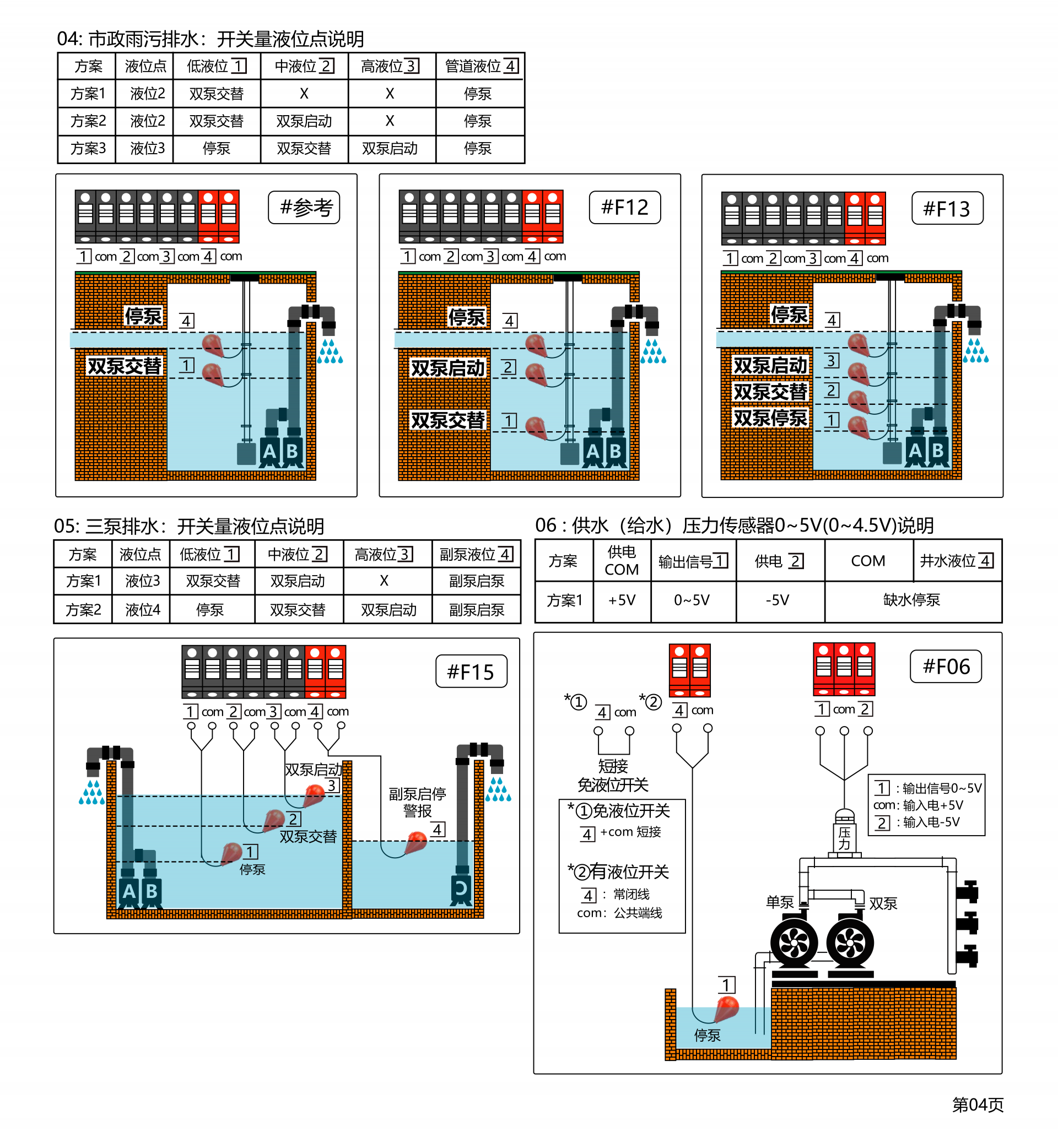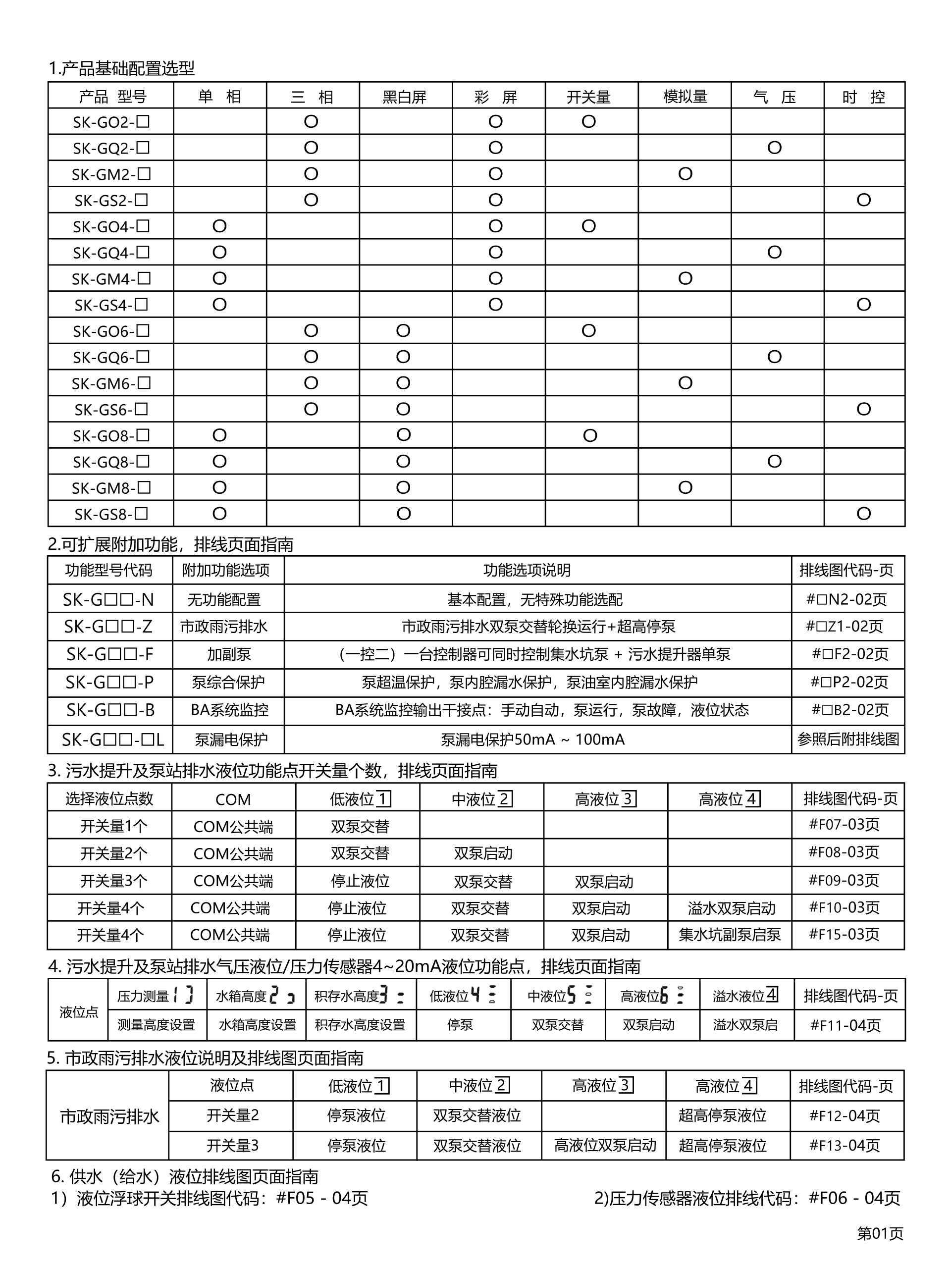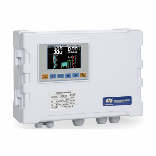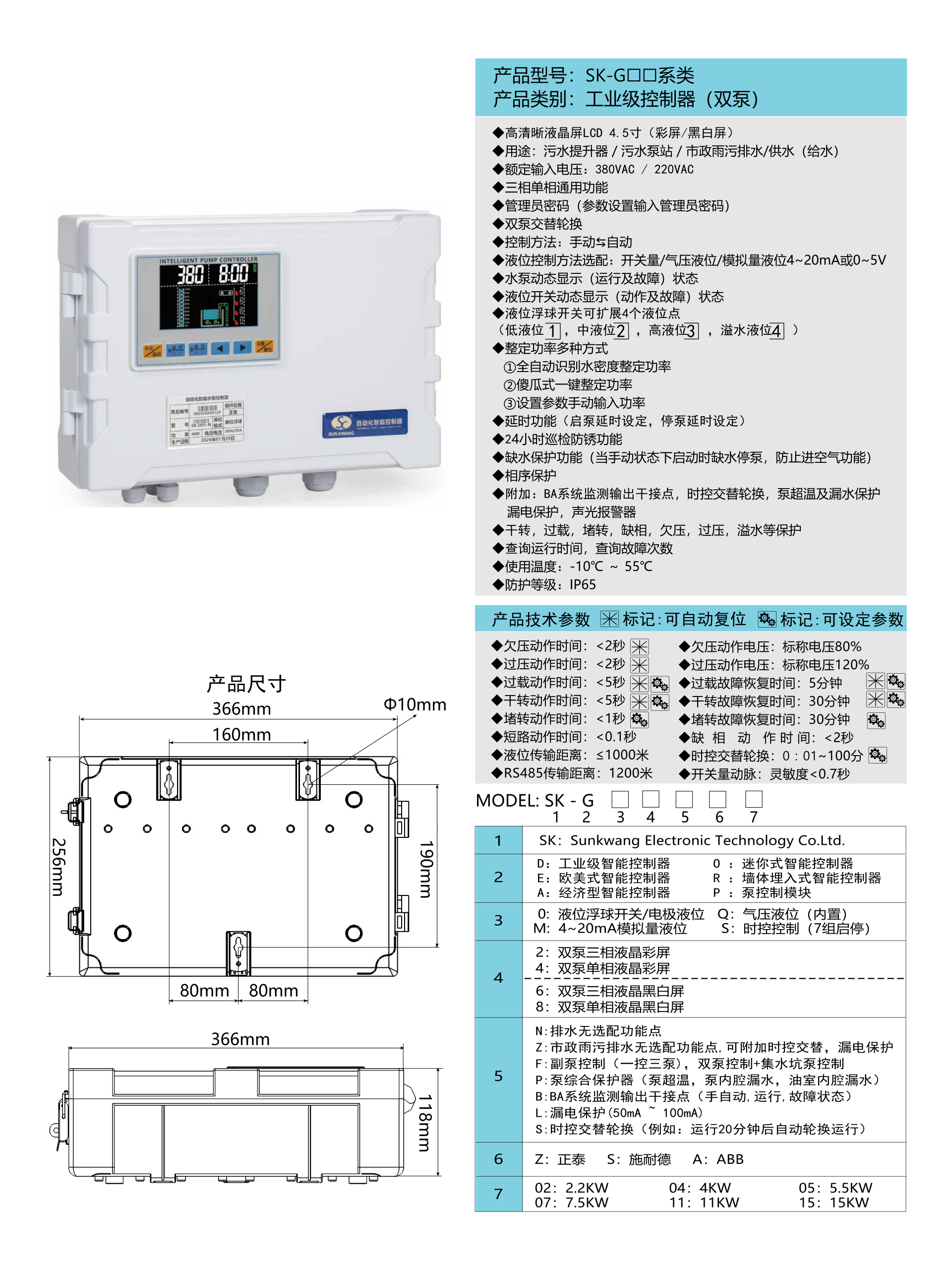 产品型号:SK-G□□系类 产品类别:工业级控制器(双泵) ◆高清晰液晶屏LCD 4.5寸(彩屏/黑白屏) ◆用途:污水提升器 / 污水泵站 / 市政雨污排水/供水(给水) ◆额定输入电压:380VAC / 220VAC ◆三相单相通用功能 ◆管理员密码(参数设置输入管理员密码) ◆双泵交替轮换 ◆控制方法:手动⇋自动 ◆液位控制方法选配:开关量/气压液位/模拟量液位4~20mA或0~5V ◆水泵动态显示(运行及故障)状态 ◆液位开关动态显示(动作及故障)状态 ◆液位浮球开关可扩展4个液位点 (低液位①,中液位②,高液位③,溢水液位④) ◆整定功率多种方式 ①全自动识别水密度整定功率 ②傻瓜式一键整定功率 ③设置参数手动输入功率 ◆延时功能(启泵延时设定,停泵延时设定) ◆24小时巡检防锈功能 ◆缺水保护功能(当手动状态下启动时缺水停泵,防止进空气功能) ◆相序保护 ◆附加:BA系统监测输出干接点,时控交替轮换,泵超温及漏水保护,漏电保护,声光报警器 ◆干转,过载,堵转,缺相,欠压,过压,溢水等保护 ◆查询运行时间,查询故障次数 ◆使用温度:-10℃ ~ 55℃ ◆防护等级:IP65