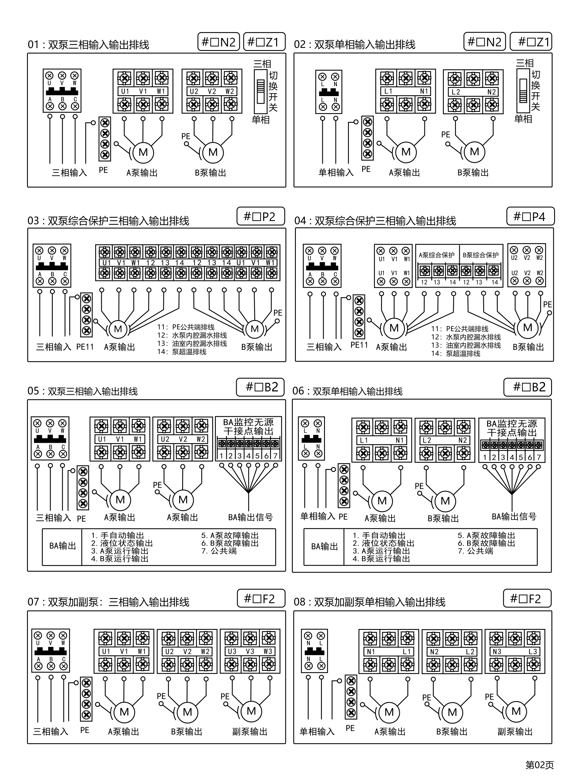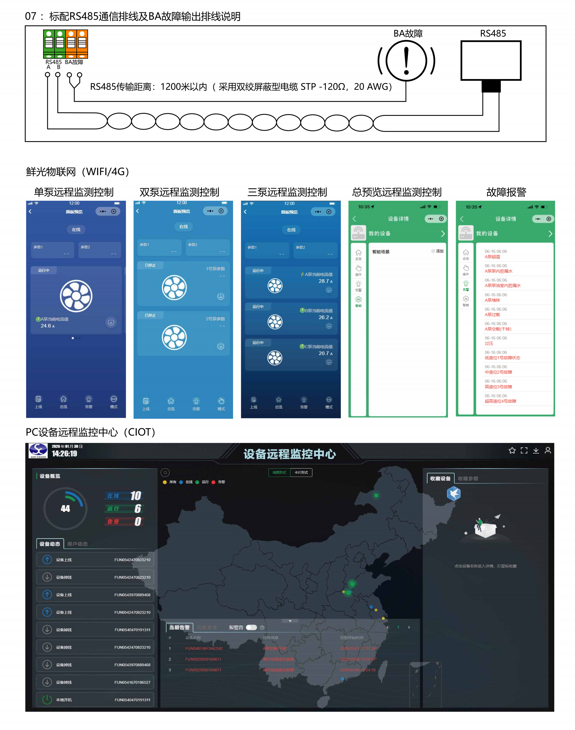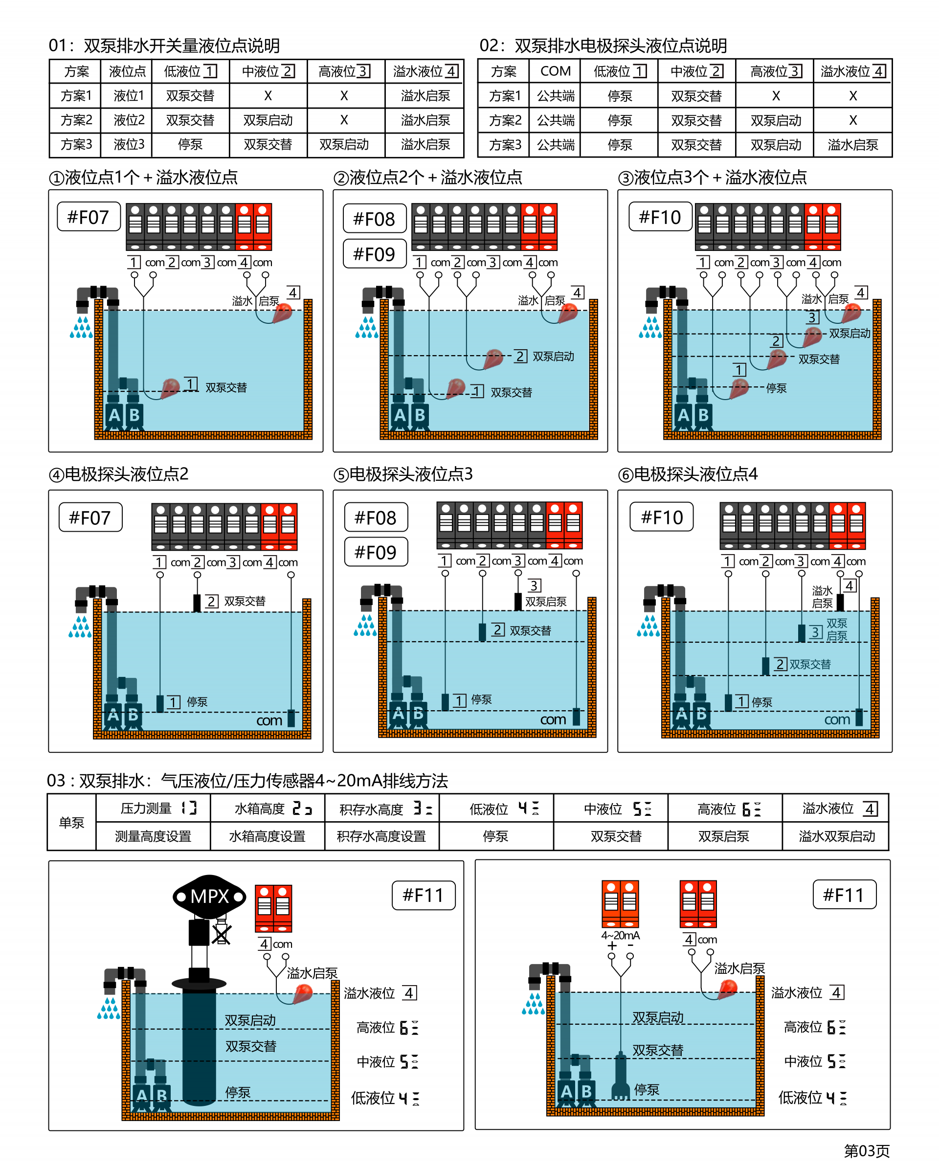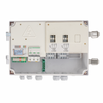 产品型号:SK-G□□系类 产品类别:工业级控制器(双泵) ◆高清晰液晶屏LCD 4.5寸(彩屏/黑白屏) ◆用途:污水提升器 / 污水泵站 / 市政雨污排水/供水(给水) ◆额定输入电压:380VAC / 220VAC ◆三相单相通用功能 ◆管理员密码(参数设置输入管理员密码) ◆双泵交替轮换 ◆控制方法:手动⇋自动 ◆液位控制方法选配:开关量/气压液位/模拟量液位4~20mA或0~5V ◆水泵动态显示(运行及故障)状态 ◆液位开关动态显示(动作及故障)状态 ◆液位浮球开关可扩展4个液位点 (低液位①,中液位②,高液位③,溢水液位④) ◆整定功率多种方式 ①全自动识别水密度整定功率 ②傻瓜式一键整定功率 ③设置参数手动输入功率 ◆延时功能(启泵延时设定,停泵延时设定) ◆24小时巡检防锈功能 ◆缺水保护功能(当手动状态下启动时缺水停泵,防止进空气功能) ◆相序保护 ◆附加:BA系统监测输出干接点,时控交替轮换,泵超温及漏水保护,漏电保护,声光报警器 ◆干转,过载,堵转,缺相,欠压,过压,溢水等保护 ◆查询运行时间,查询故障次数 ◆使用温度:-10℃ ~ 55℃ ◆防护等级:IP65
