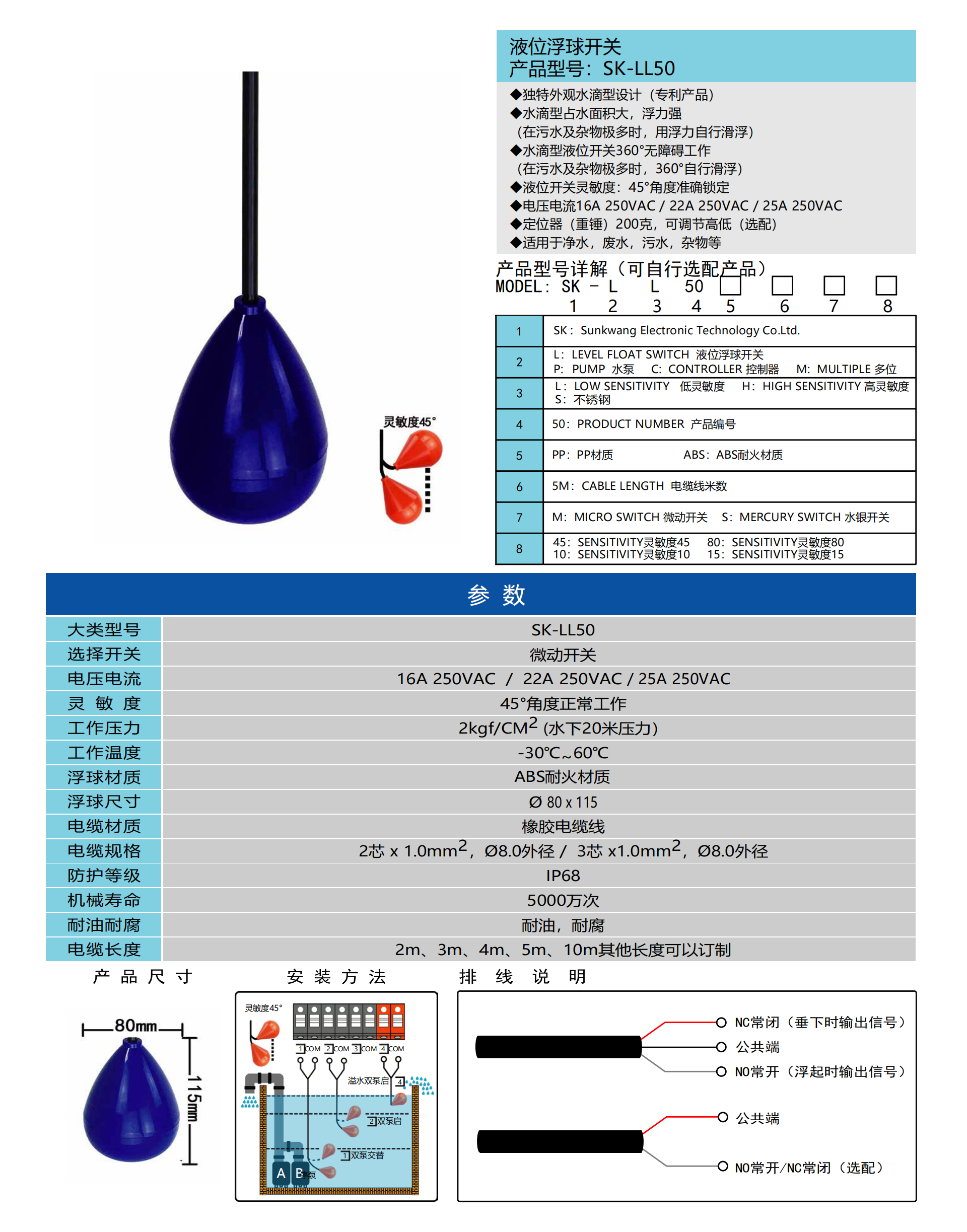 液位浮球开关 产品型号:SK-LL50 ◆独特外观水滴型设计(专利产品) ◆水滴型占水面积大,浮力强 (在污水及杂物极多时,用浮力自行滑浮) ◆水滴型液位开关360°无障碍工作 (在污水及杂物极多时,360°自行滑浮) ◆液位开关灵敏度:45°角度准确锁定 ◆电压电流16A 250VAC / 22A 250VAC / 25A 250VAC ◆定位器(重锤)200克,可调节高低(选配) ◆适用于净水,废水,污水,杂物等