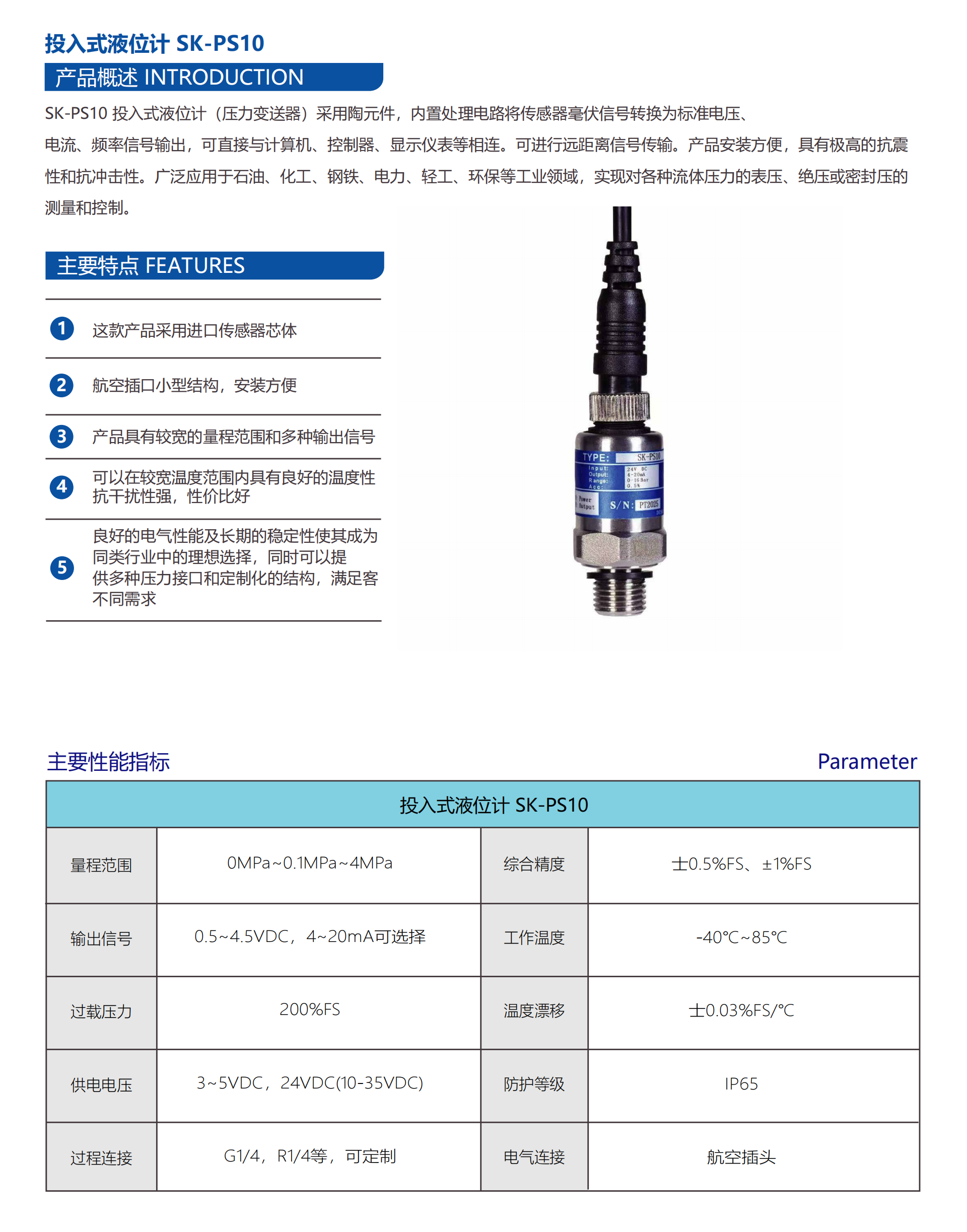 SK-PS10 压力变送器采用陶瓷元件,内置处理电路将传感器毫伏信号转换为标准电压、电流、频率信号输出,可直接与计算机、控制器、显示仪表等相连。可进行远距离信号传输。产品安装方便,具有极高的抗震性和抗冲击性。广泛应用于石油、化工、钢铁、电力、轻工、环保等工业领域,实现对各种流体压力的表压、绝压或密封压的测量和控制。