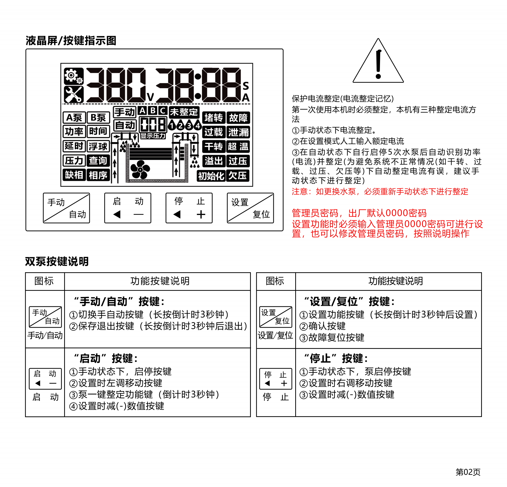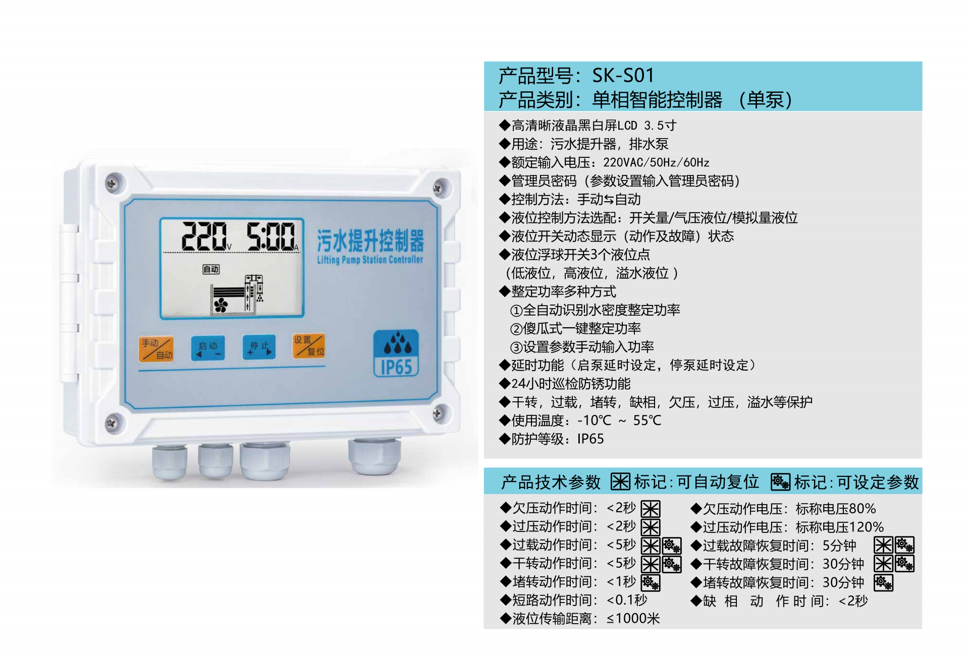 产品型号:SK-S01 产品类别:单相智能控制器(单泵) ◆ 高清晰液晶黑白屏LCD 3.5寸 ◆ 用途:污水提升器,排水泵 ◆ 额定输入电压:220VAC/50Hz/60Hz ◆ 管理员密码(参数设置需输入管理员密码) ◆ 控制方法:手动⇋自动 ◆ 液位控制方法选配:开关量/气压液位/模拟量液位 ◆ 液位开关动态显示(动作及故障)状态 ◆ 液位浮球开关3个液位点(低液位,高液位,溢水液位) ◆ 整定功率多种方式 ①全自动识别水密度整定功率 ②傻瓜式一键整定功率 ③设置参数手动输入功率 ◆ 延时功能(启泵延时设定,停泵延时设定) ◆ 24小时巡检防锈功能 ◆ 干转,过载,堵转,缺相,欠压,过压,溢水等保护 ◆ 使用温度:-10℃ ~ 55℃ ◆ 防护等级:IP65
