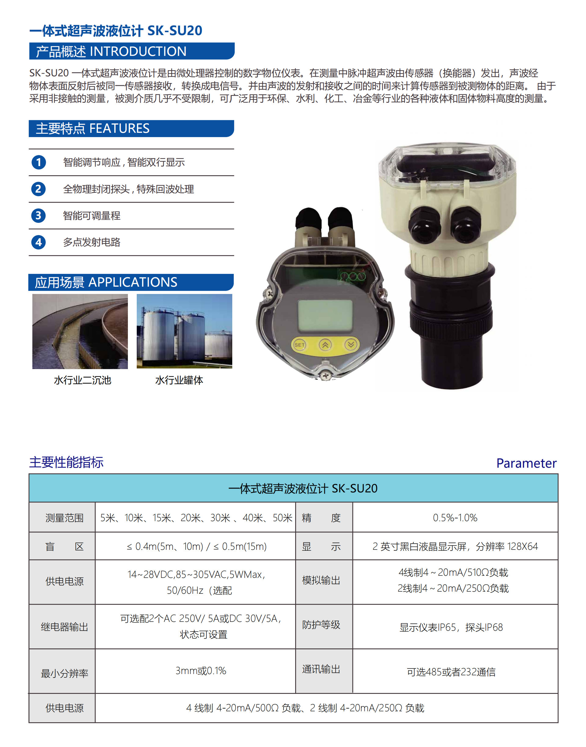 SK-SU20 一体式超声波液位计是由微处理器控制的数字物位仪表。在测量中脉冲超声波由传感器(换能器)发出,声波经物体表面反射后被同一传感器接收,转换成电信号。并由声波的发射和接收之间的时间来计算传感器到被测物体的距离。由于采用非接触的测量,被测介质几乎不受限制,可广泛用于环保、水利、化工、冶金等行业的各种液体和固体物料高度的测量。