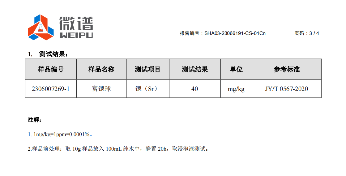 为了保证富锶球的质量,鑫永恒新材料将产品送到了权威的第三方检测机构进行检测。
